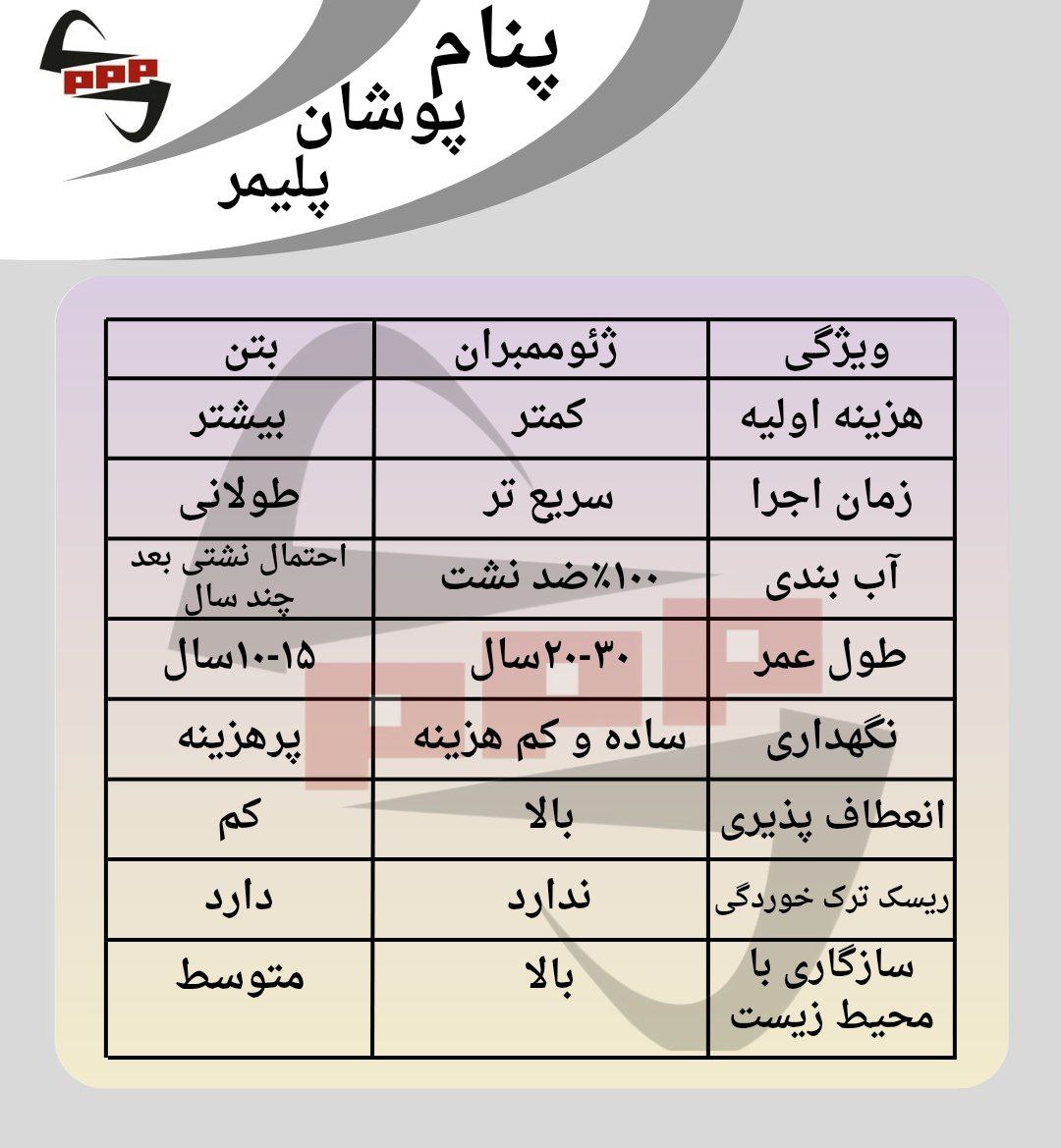 ژئوممبران ۲۰ تا ۳۰ سال عمر مفید دارد، در حالیکه بتن معمولاً بعد از ۱۰ سال دچار ترک و نشتی میشود.